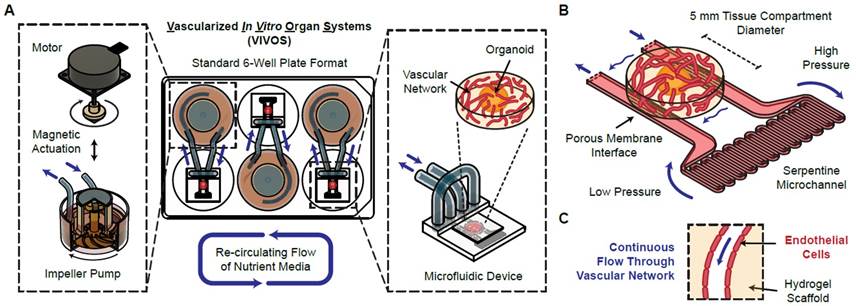 Figure 1. VIVOS platform for electromechanical perfusion of in vitro human vascular beds. (A) The device is composed of a magnetically actuated impeller pump and a microfluidic channel containing a tissue compartment that spans the two arms of the channel. (B) A serpentine microchannel creates a pressure differential in the channel arms, enabling transverse flow through the tissue compartment. (C) This supports formation and continuous perfusion of a vascular network in the absence or presence of implanted 3D tissues (e.g., organoids).